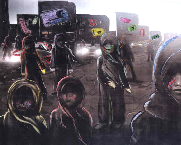 I found myself on a busy street. It was not just normal busy but really really busy. There were people walking by and they were in a terrible hurry, and they appeared mostly as blurs and streaks. Nobody seemed to notice me. The people were dressed in all sorts of colors: reds, blues, deep purple, white, indigo, green, long sashes and head coverings. The colors were vivid, which was surprising to me because all my dreams are in shades of gray, up until this one. I also noticed the people had makeup on their faces and some on their bodies and hands, the kind that is associated with tribal rituals.