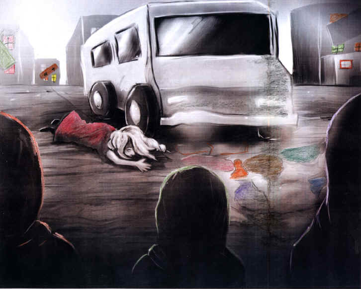 During this entire time I saw only one vehicle, a white van and it was driving dangerously fast through the teaming crowd. Then it hit a little girl in a red dress. The little girl was not seriously hurt but the van pinned her long blonde hair under it’s right front wheel. The little girl kept saying “stop, ouwe, it hurts, ouwe, stop”. I could only watch helplessly.