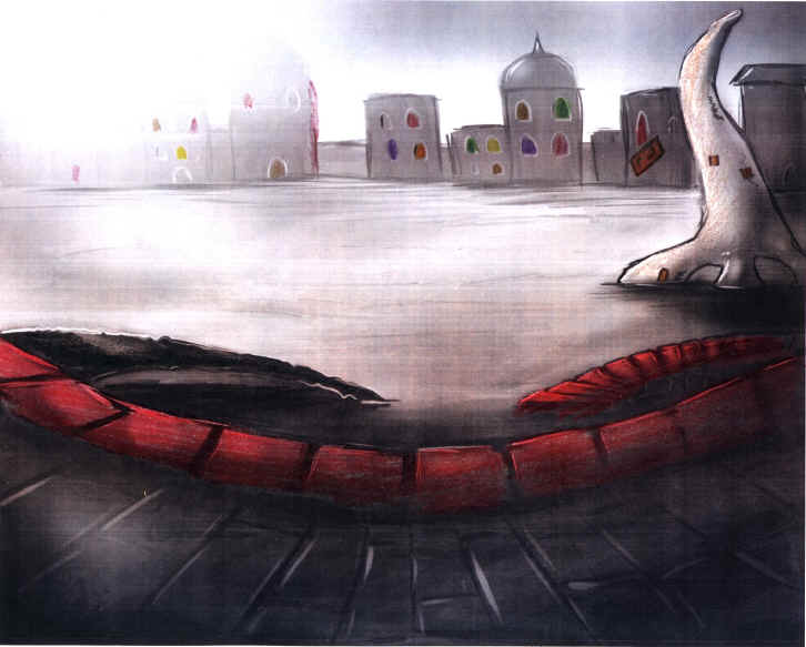 Eventually we came to a wide vista. It was a beautiful sight. I was standing on a high patio carved into the side of a large steep hill. It had beautiful flowing red irregular tile which formed a sort of terraced walk way. On the right was a neatly curved staircase also of red tile that sloped down to a dull paved gray surface below. On the left side was a dark ramp that also slanted down and eventually met the surface below, but was sloppy and jagged.